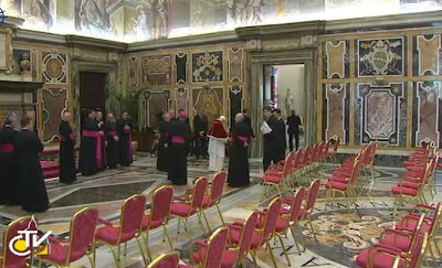 Prior to bidding farewell to each of you personally, I want to tell you that I will continue to be close to you in prayer, especially in the next few days, so that you may all be fully docile to the action of the Holy Spirit in the election of the new Pope. May the Lord show you what is willed by Him. And among you, among the College of Cardinals, there is also the future Pope, to whom, here to today, I already promise my unconditional reverence and obedience. For all this, with affection and gratitude, I cordially impart upon you my Apostolic Blessing.