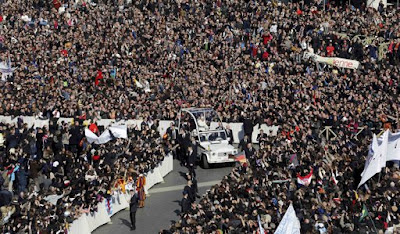 On a cold, but brightly sunny morning, the Popemobile wended around St Peter's Square in one last trip for the departing pontiff to greet the masses in attendance, stopping even today to continue Benedict's longtime practice of giving a kiss and blessing to the babies and toddlers passed over the crowd by attendees.