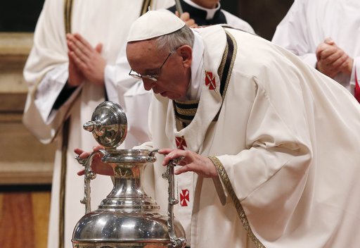 A good priest can be recognized by the way his people are anointed. This is a clear test. When our people are anointed with the oil of gladness, it is obvious: for example, when they leave Mass looking as if they have heard good news. Our people like to hear the Gospel preached with “unction”, they like it when the Gospel we preach touches their daily lives, when it runs down like the oil of Aaron to the edges of reality, when it brings light to moments of extreme darkness, to the “outskirts” where people of faith are most exposed to the onslaught of those who want to tear down their faith. People thank us because they feel that we have prayed over the realities of their everyday lives, their troubles, their joys, their burdens and their hopes. And when they feel that the fragrance of the Anointed One, of Christ, has come to them through us, they feel encouraged to entrust to us everything they want to bring before the Lord: “Pray for me, Father, because I have this problem”, “Bless me”, “Pray for me” – these words are the sign that the anointing has flowed down to the edges of the robe, for it has turned into prayer. The prayers of the people of God. When we have this relationship with God and with his people, and grace passes through us, then we are priests, mediators between God and men. What I want to emphasize is that we need constantly to stir up God’s grace and perceive in every request, even those requests that are inconvenient and at times purely material or downright banal – but only apparently so – the desire of our people to be anointed with fragrant oil, since they know that we have it. To perceive and to sense, even as the Lord sensed the hope-filled anguish of the woman suffering from hemorrhages when she touched the hem of his garment. At that moment, Jesus, surrounded by people on every side, embodies all the beauty of Aaron vested in priestly raiment, with the oil running down upon his robes. It is a hidden beauty, one which shines forth only for those faith-filled eyes of the woman troubled with an issue of blood. But not even the disciples – future priests – see or understand: on the “existential outskirts”, they see only what is on the surface: the crowd pressing in on Jesus from all sides (cf. Lk 8:42). The Lord, on the other hand, feels the power of the divine anointing which runs down to the edge of his cloak.