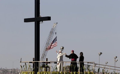 ...and from just a few minutes and a couple hundred meters later, the English translation of the pontiff's homily at this trek's closing Mass, celebrated before a crowd of some 350,000 at the Ciudad Juarez fairgrounds – drawing upon today's assigned readings, a preach as impassioned and strong as was expected for the moment: