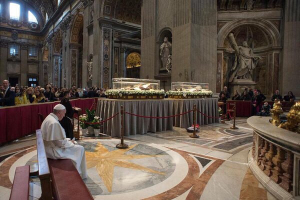 To highlight the centrality of sacramental Reconciliation to the Missionaries' task – and this Holy Year all told – tonight's liturgy was the centerpiece event for the weeklong presence in Rome of the glass caskets containing the remains of Padre Pio, the Capuchin mystic long the focus of fanatical devotion worldwide, and the Croatian-born Italian friar St Leopold Mandic, their relics called in by Francis given the duo's shared devotion to the ministry of the Confessional. Likely to be this Jubilee Year's largest Vatican event in terms of crowds, the display of both saints' bodies in St Peter's ends tomorrow.