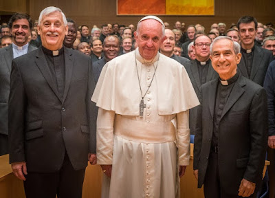 Having won over the Society after initial skepticism upon his election – so much so that, for the first time ever, the GC left Europe to pick a Father-General in the Latin American pontiff's mould – Francis had already met privately with the new "Black Pope" Fr Arturo Sosa (above left) over an evening last week at the Domus.
