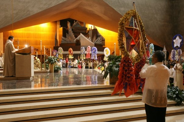 An inculturated form of the venerable Rorate caeli Advent Mass brought by the Spanish colonists some five centuries back, though the celebration of what's also called the "Misa de Aguinaldo" ("Mass of the Gift") is normally still observed between 4 and 5am in the Philippines itself -- where churches (or other, bigger venues) invariably fill to overflowing for the cherished practice -- the daily liturgies in the States are often, if not usually, transferred to the evening hours in order to accommodate the faithful's work schedules.Regardless of its time, though, the tradition isn't just liturgical -- a potluck breakfast or supper customarily follows the Mass. And above all, like all the best of things Catholic, organizers invariably spare no degree of energy to spread the word that everyone -- everyone -- is welcome.